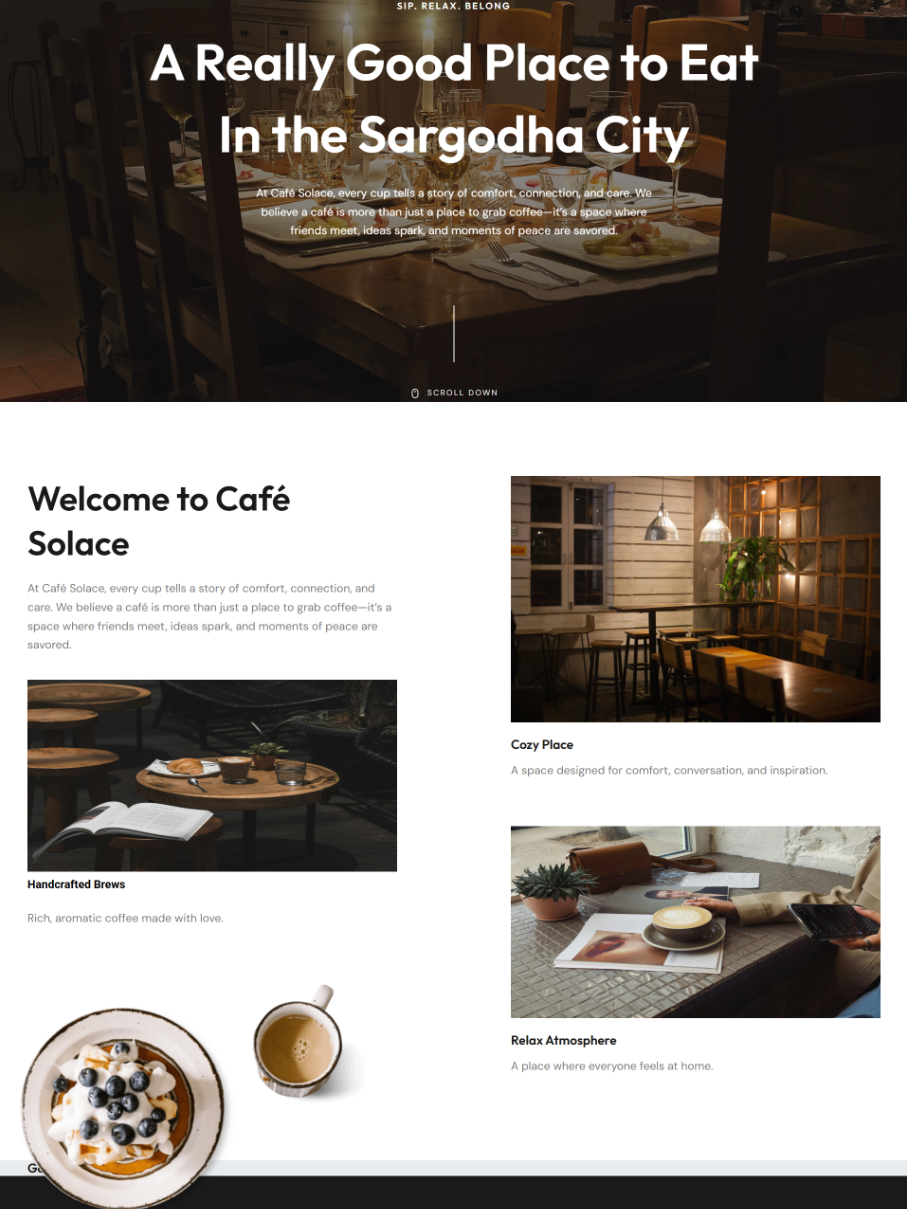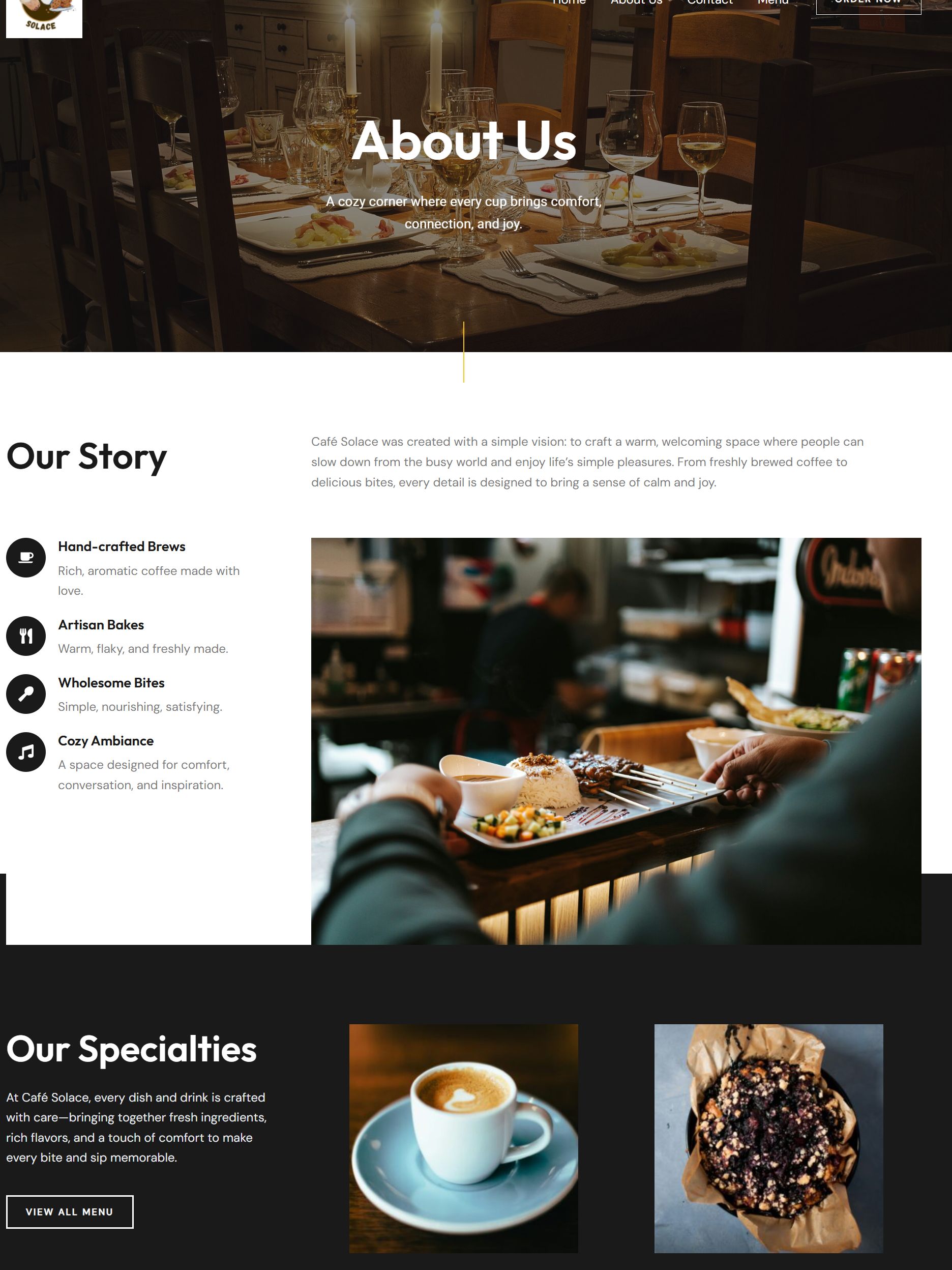A cozy café website built on WordPress with a modern, inviting design. Features: Menu showcase, customer testimonials, and responsive layout built with Elementor.