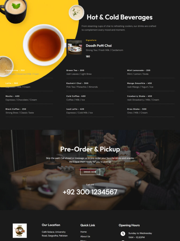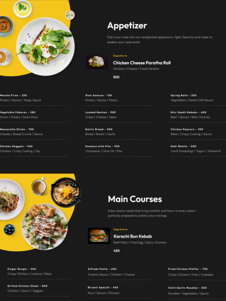 - Interactive menu showcase highlighting food and beverage options
